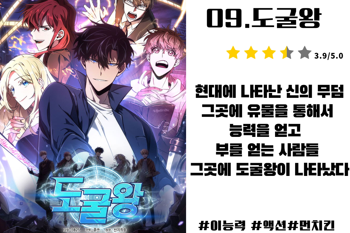 지겹다고 느껴질 수 있지만 처음에 이런 웹툰들의 특징이 한번 빠지면 그와 비슷한 결의 웹툰을 소비하려는 특징이 있기 때문에 나혼자만 레벨업도 재미있게 보셨다면 도굴왕 또한 추천드립니다.
